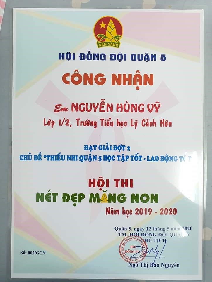 Ngày 01/6/2020, Thầy Võ Minh Thành - Bí thư chi bộ-Hiệu trưởng nhà trường; Cô Châu Thị Nga - GVCN lớp 2/1; Thầy Phó Thế Minh -Tổng phụ trách Đội cùng trao tặng giấy chứng nhận và giải thưởng của Hội đồng Đội Trung ương - Trung tâm hỗ trợ và phát triển Việt Nam - Nhãn hàng Thiên Long tại lớp. Chúc bạn luôn có nhiều phấn đấu trong học tập, tham gia tốt các phong trào và hoạt động Đội, luôn sáng tạo và tự tin, trở thành tấm gương cho các bạn Nhi đồng, Đội viên học sinh noi theo.